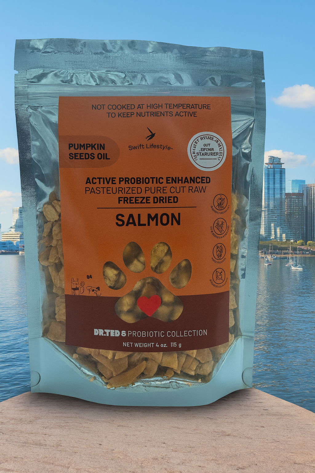 Give your pet a clean, functional treat designed for real digestive and immune support. Swift Lifestyle™ Active Probiotic Enhanced Freeze-Dried Salmon is crafted for pets that need high-quality protein, microbiome stability, and nutrient-dense ingredients without any fillers or synthetic additives. This formula is part of Dr. Ted’s Probiotic Collection, engineered to bring science-backed probiotic technology into everyday pet nutrition.
