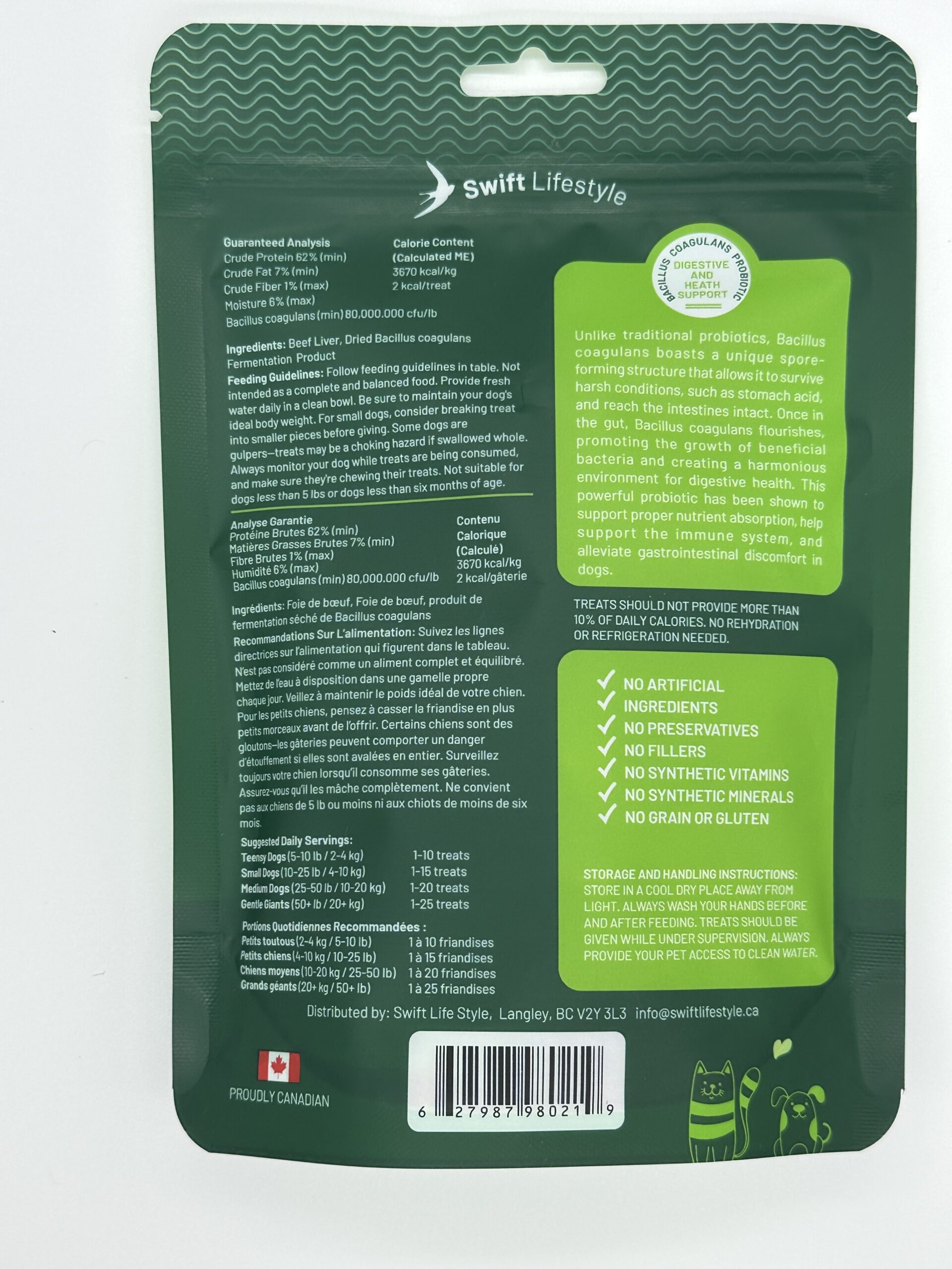 These freeze dried beef liver treats combine pure beef liver with Bacillus coagulans probiotics to support your dog’s digestive and immune health.Our freeze dried beef liver treats are single-ingredient and grain free and each bag of freeze dried beef liver treats delivers stable Bacillus coagulans probiotics.