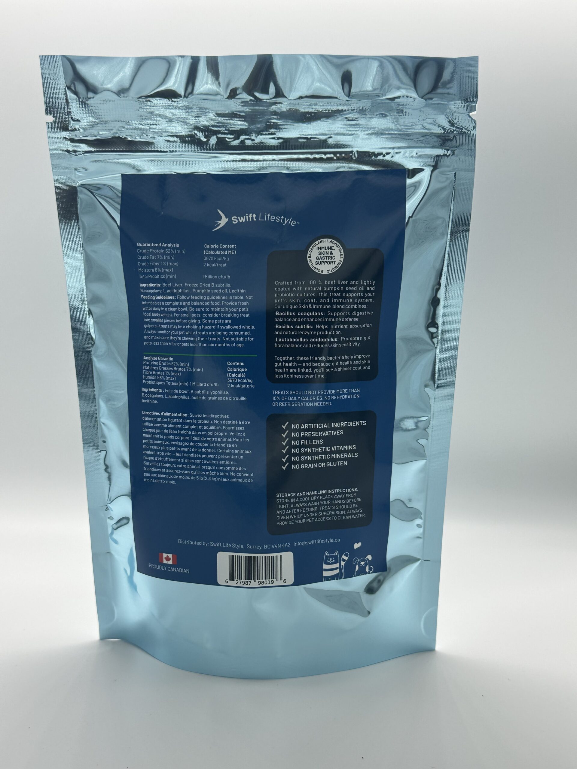 Swift Lifestyle™ combines clean nutrition with advanced probiotic science. Every bag is made in small batches, pasteurized for safety, and freeze-dried to protect active nutrients. Our treats avoid high heat, fillers, preservatives, and synthetic additives — giving your pet pure, functional, gut-friendly ingredients that support digestion, immunity, skin health, and nutrient absorption.