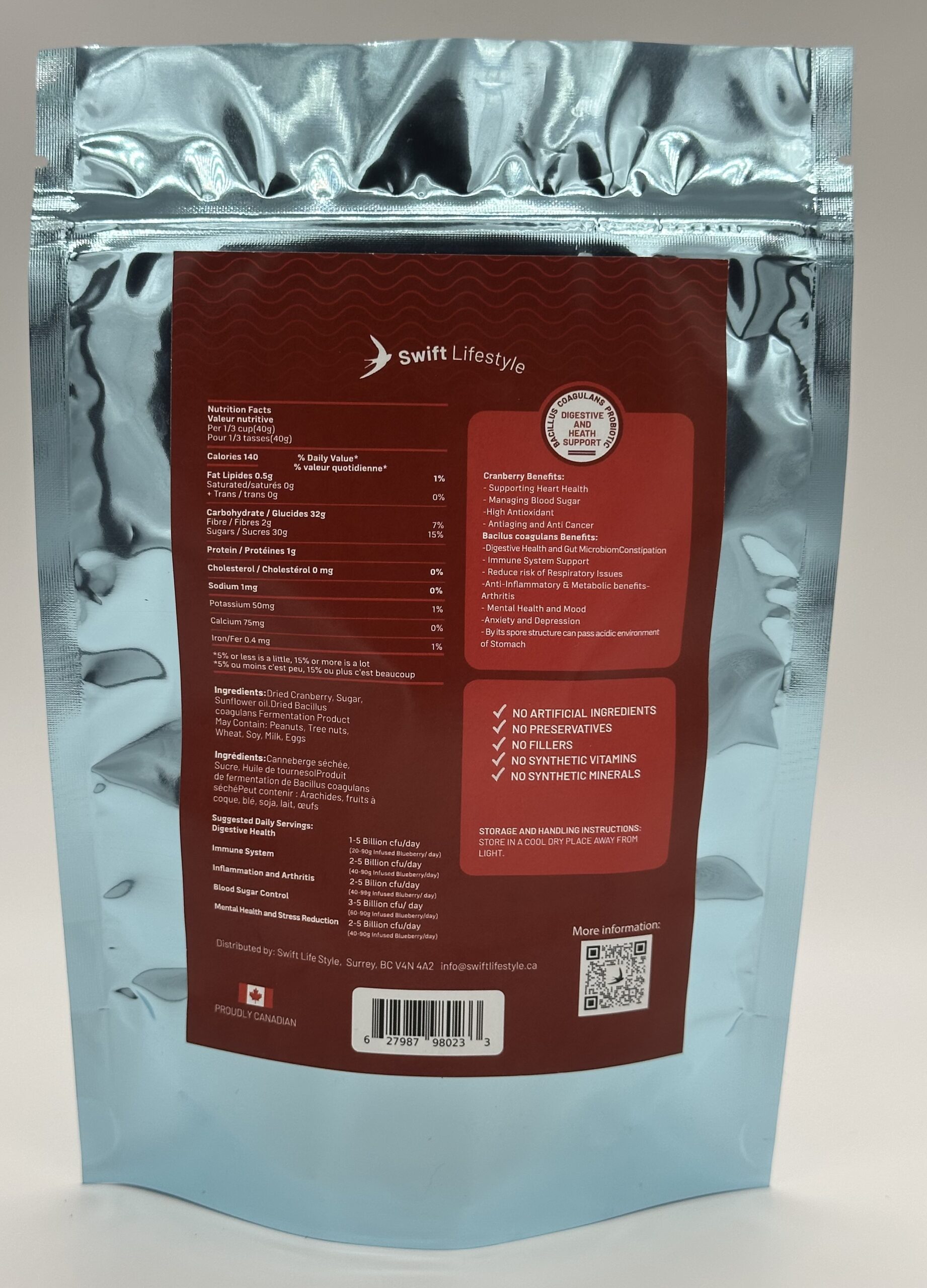 Our Probiotic Infused Dried Cranberries are carefully dried and infused with Bacillus coagulans, a robust, spore‑forming probiotic that survives stomach acid and reaches the gut alive. The result is a snack that delivers both antioxidant power and clinically relevant probiotic support in a simple, shelf‑stable format.